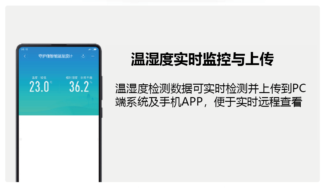 这款温湿度监控器是一种以无线通讯为传输手段的温湿度监测设备,通过温度传感器和湿度传感器实时对室内的温度、湿度进行监测,监测数据可以通过无线传输的方式进行传送,供热企业从手机直接查看数据,及时了解供热区域的温湿度情况。同时,温湿度记录仪还可以设置温湿度阈值,超出设定温湿度安全范围手机会自动预警,供热企业可以及时采取措施。