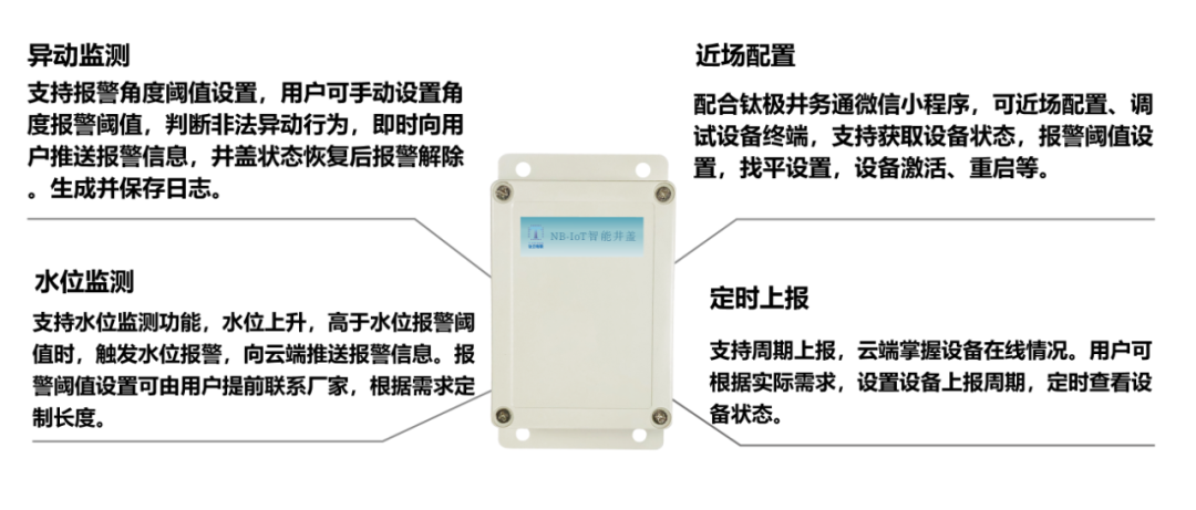 支持报警角度阈值设置,用户可手动设置角度报警阈值,判断非法异动行为,即时向用户推送报警信息,井盖状态恢复后报警解除。