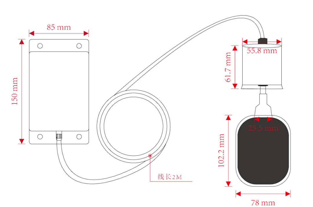 支持水位监测功能,水位上升,高于水位报警阈值时,触发水位报警,向云端推送报警信息。报警阈值设置可由用户提前联系厂家,根据需求定制长度。